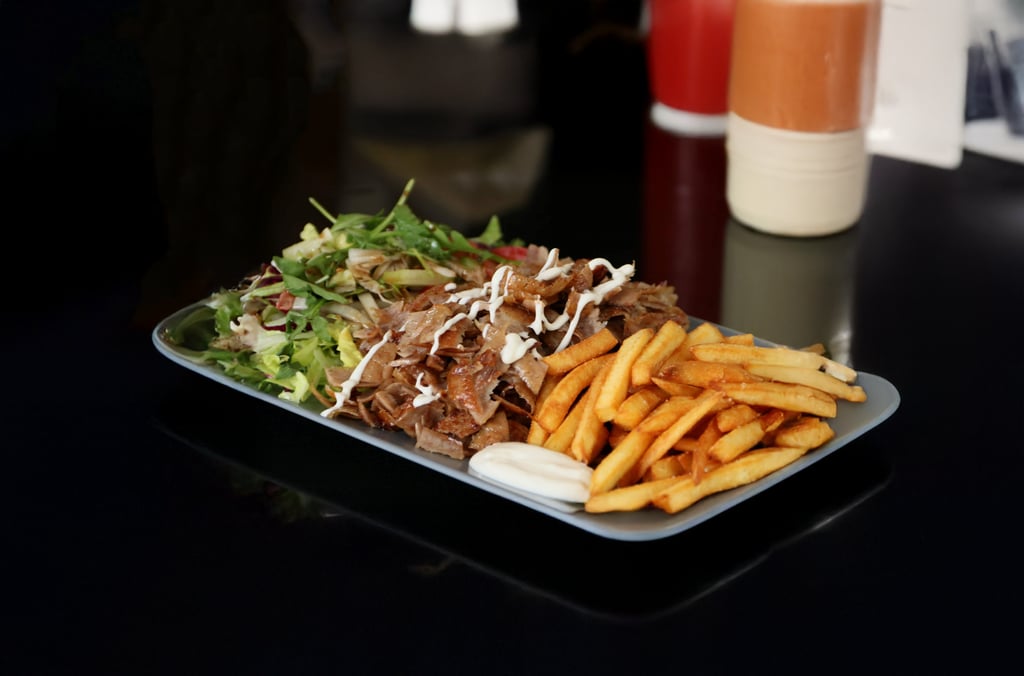 Gegrilltes Fleisch vom Scheibendrehspieß auf einem Teller, serviert mit Pommes, frischem Salat und Sauce nach Wahl.