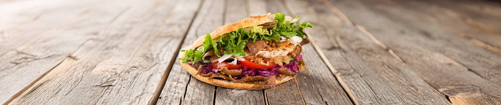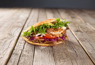 Frisch gebackener,dünn ausgerollter Fladen, gefüllt mit saftig gegrilltem Fleisch und frischem Gemüse.