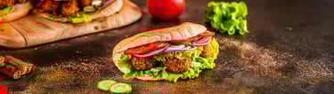 Vegetarischer Döner oder Falafel – frisch mit knackigem Gemüse und feinen Saucen, wahlweise im Brot, Yufka oder kleinen Fladenbrot.