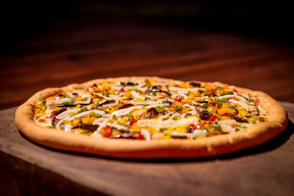 Mit Mais, Tomaten, Zwiebeln, Champignong, Oliven, Peperoni und Paprika.