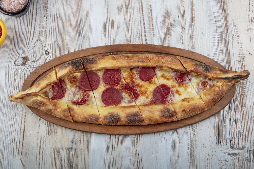 Frisch zubereitete Pide mit knusprigem, herzhaftem Teig und frischem Belag.
