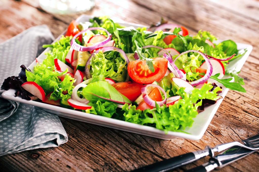 Drehspieß mit frischem Gemüse und Pommes auf einem Teller.